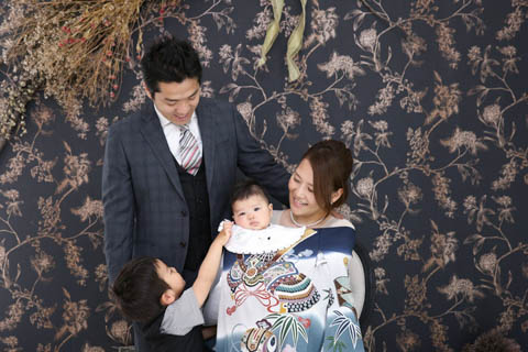 男の子のお宮参りでの服装は、黒や濃紺など濃い色の掛け着を選ぶのが一般的。