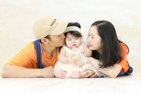 写真スタジオでプロのカメラマンに、赤ちゃんと一緒に家族写真を残すことも定番のお祝いになっています。