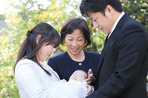 お宮参りの際は、同行するパパ、ママ、おじいさま・おばあさまと赤ちゃんのバランスが大切です。