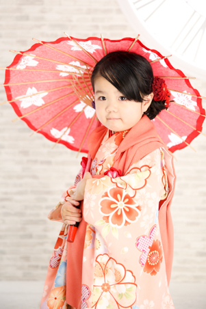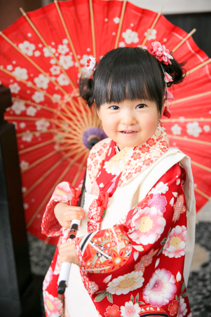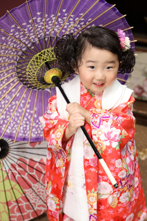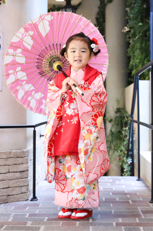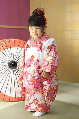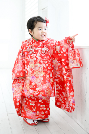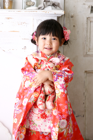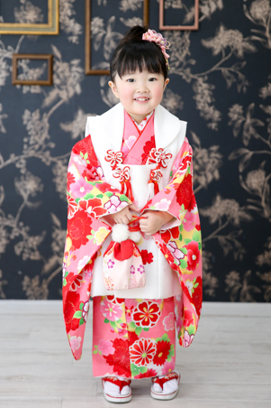 赤い着物×白い被布。お着物だったら一度は着せてみたい3歳の王道!