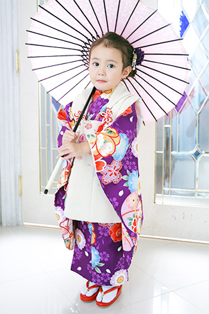 パステルカラーの紫の着物が華やかな印象を与えてくれる一着です。7歳用のデザインもあるので姉妹お揃いもオススメ!