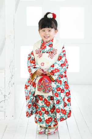 小花柄をあしらった赤の着物に白い被布。子供らしさを引き出すのに抜群な王道着物です♪