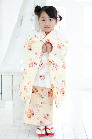 真っ白の被布に黄色地の着物の優しい色合いがマッチし、お子様の可愛さを引き立たせてくれる1着です。