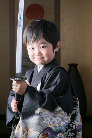 白地に松の柄が各敷高さを醸し出します。長着の黒が男の子の凛々しさを引き立てます。