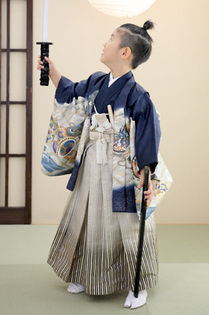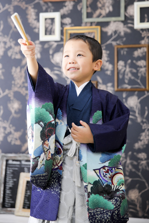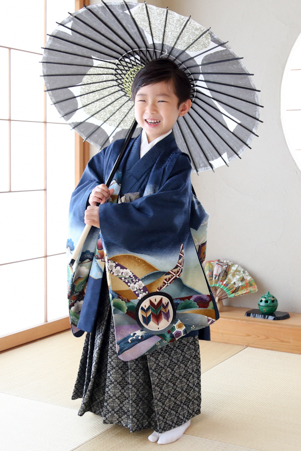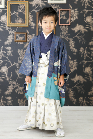 シンプルながらも男の子らしさを引き立たせる紺色のお着物。どんな袴にもマッチします。