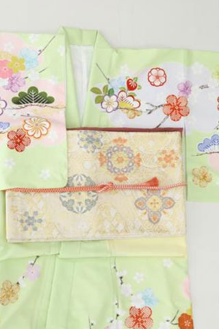 自然を連想させるグリーンの着物には、松や梅などの縁起物があしらわれているので、お祝いの場に相応しい柄と言えます。
