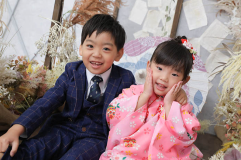撮影プランは、和装と洋装のどちらも着れて、着付けやヘアメイクだけでなく、ごきょうだい用の衣装レンタルやご家族写真撮影や撮影データ50カットがついてきて、前撮りであれば2万円台からです。