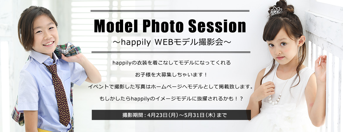 HP衣装紹介ページリのニューアルに伴い、happilyの衣装を着こなしてモデルになってくれるお子様を大募集しちゃいます!