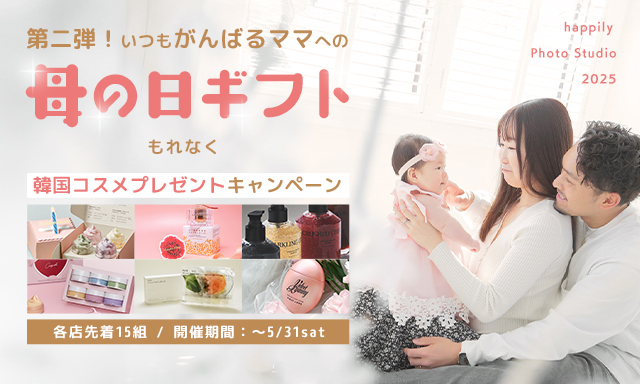 日頃子育てやお仕事をがんばっているママへの母の日ギフトとして、シートマスクやソープ類など、人気韓国コスメギフト付きの撮影プランをご案内します。