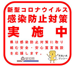 新型コロナウイルス感染防止対策に取り組む施設として、愛知県が提供するPRステッカー・ポスターを掲示しております。