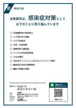 happilyフォトスタジオでは「感染防止対策を実施し、安心して利用できる施設」として感染防止対策を徹底し、感染防止徹底宣言ステッカーや感染防止対策取組書を各店舗内で掲示しております。