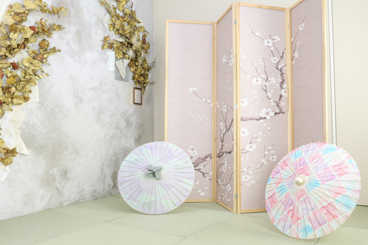 畳面と洋室部分を用意した洋装和装どちらも楽しめるお部屋。 移動可能な畳面は着物を引き立たせる壁紙で和モダンを演出。洋室部分はドレスにもぴったりなクラシックアイボリーで統一。 そのほか、シックな色合いの花壁もご用意しています。