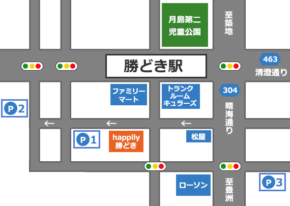 都営大江戸線「勝どき」駅A3a出口より地上に出て一つ目の角を左折し、次の角を右折してください。左手の紺色のビルの4階となります。(徒歩5分)