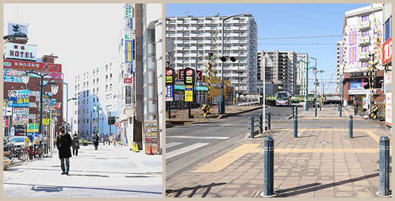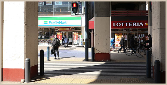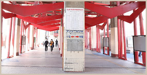 【1】改札を出たら目の前に赤い高架橋を抜けます。