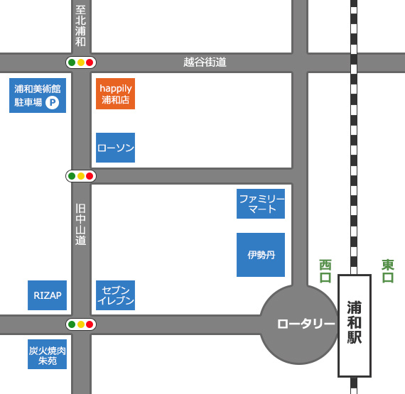 happily浦和店向かいのうらわ美術館の駐車場、もしくは近隣のコインパーキングをご利用ください。